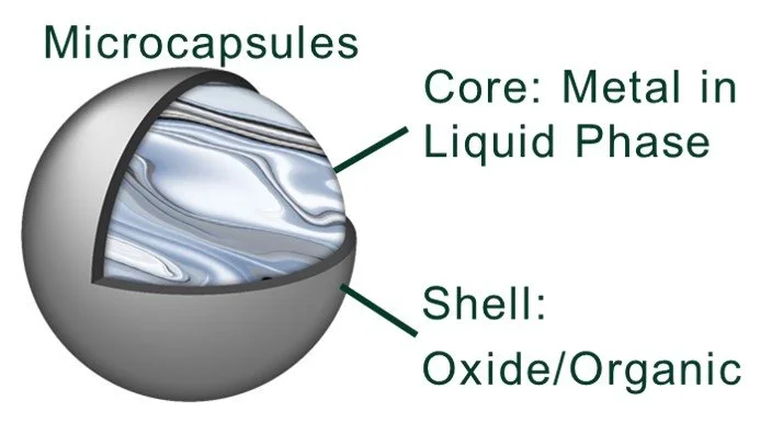At scale, millions of the encapsulated particles are suspended in a flux to make a stencil printable and heat activated supercooled solder paste.